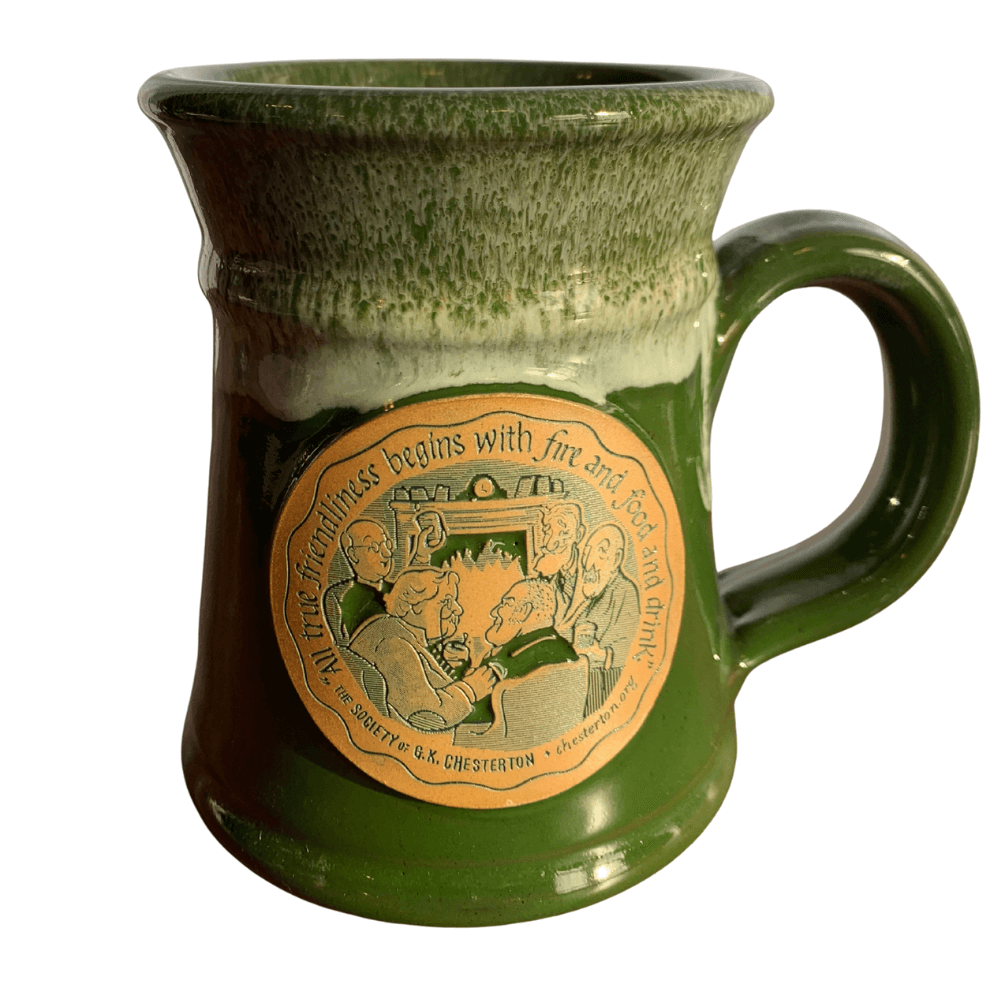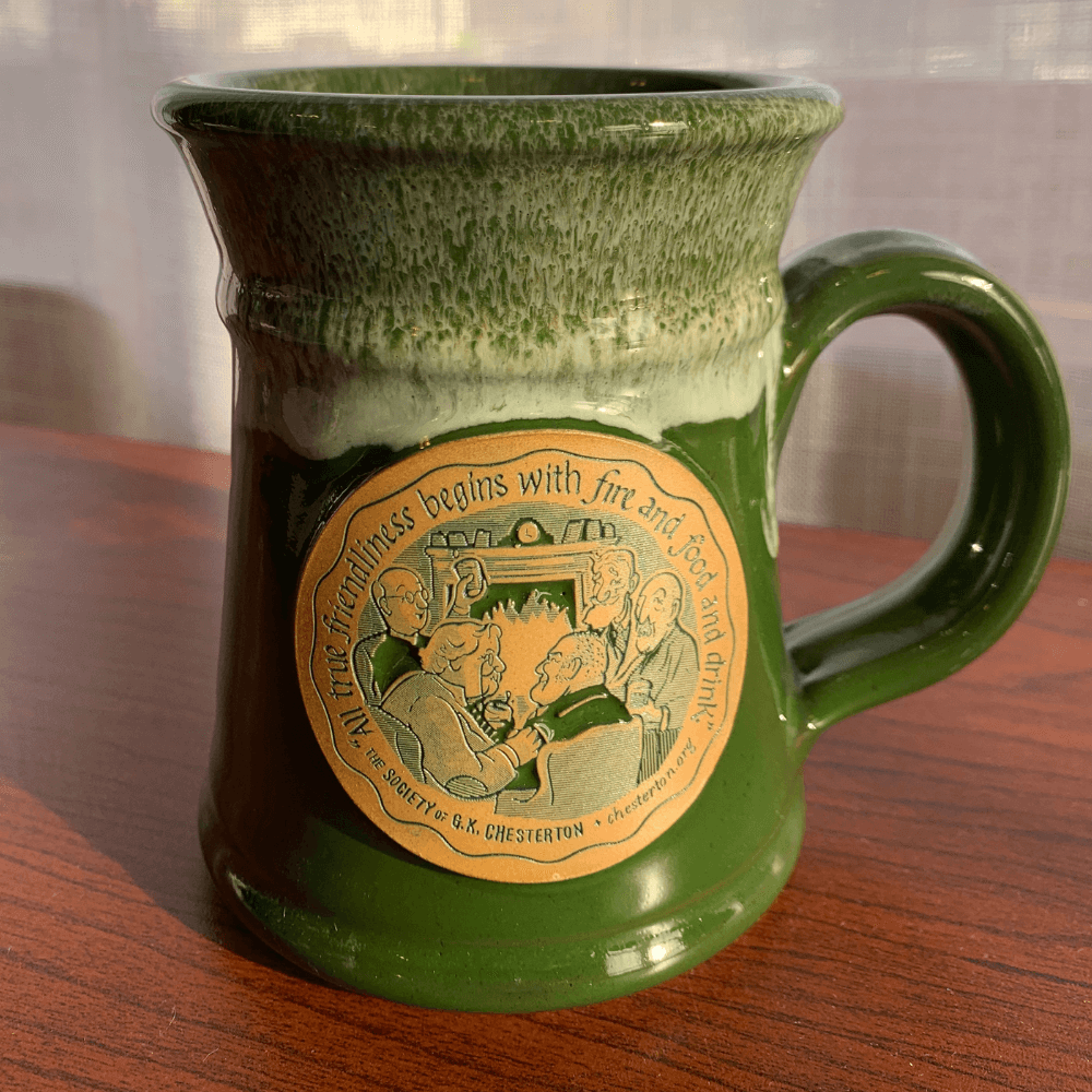 Each mug holds 14-16 0z. of coffee (or your preferred hot or cold beverage!) and features the great Chesterton quotation, “All true friendliness begins with fire and food and drink” [“Wisdom and the Weather,” What’s Wrong with the World (1910)].