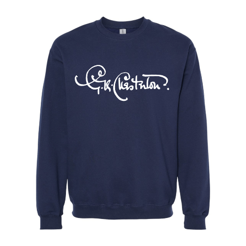 Navy Medium Blend Crewneck Sweatshirt with screen-print of Chesterton’s signature in white. 80% cotton, 20% polyester. Unisex sizing. Ineligible for member discount.