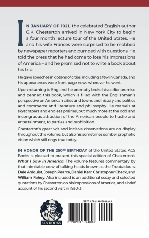 IN HONOR OF THE 250TH BIRTHDAY of the United States, ACS Books is pleased to present this special edition of Chesterton’s What I Saw in America. The volume features commentary by that inimitable crew of talking heads known as the Troubadours: Dale Ahlquist, Joseph Pearce, Daniel Kerr, Christopher Check, and William Fahey. Also included is an additional essay and selected quotations by Chesterton on his impressions of America, and a brief account of his second visit in 1930-31.
